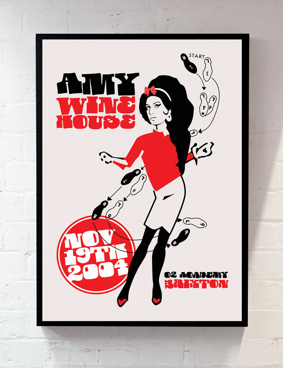 Peckham Soul presents a limited-edition concert print designed by Craig Jamieson for Amy Winehouse’s gig at the Brixton O2 Academy on 19 November 2004.