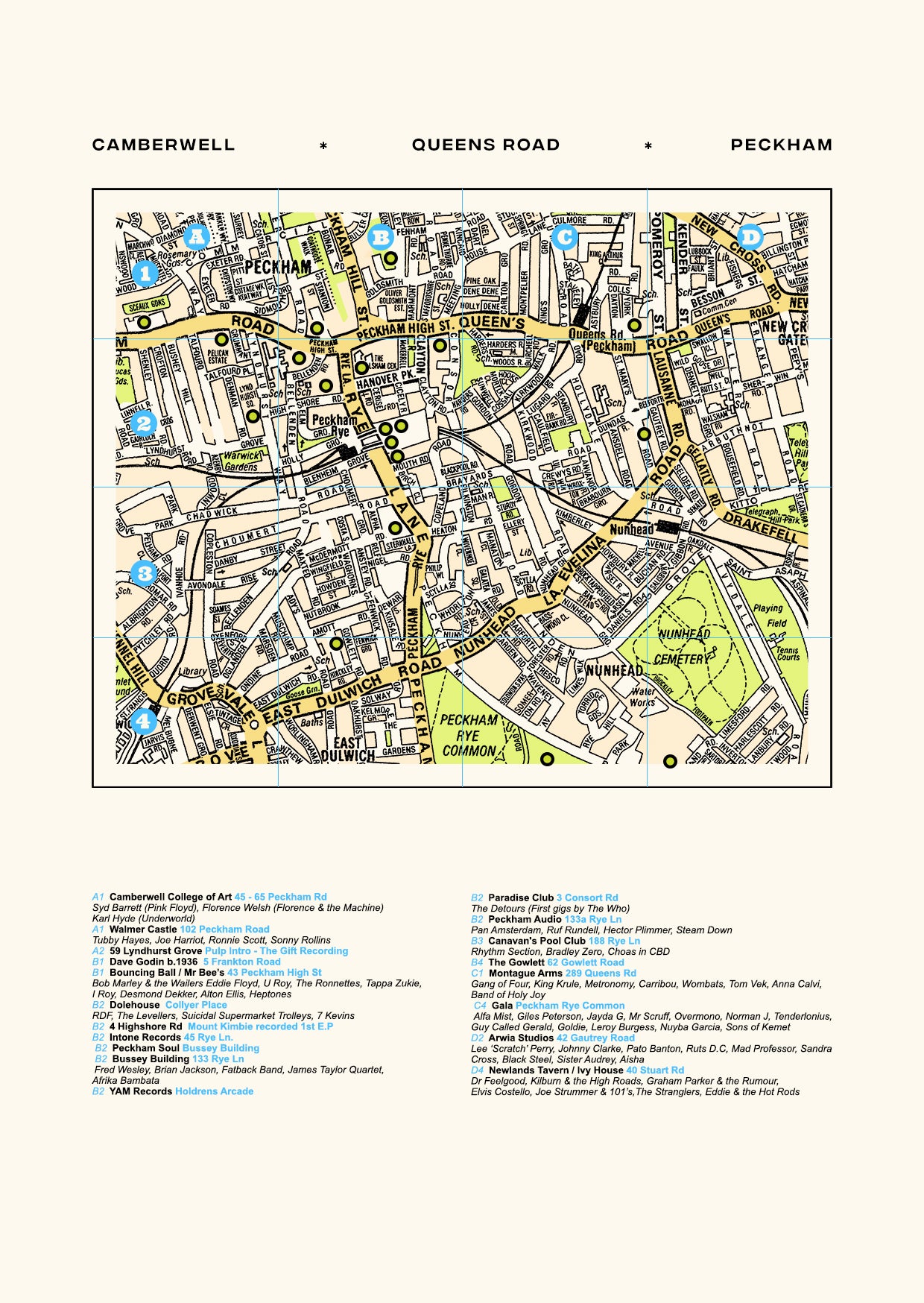 A very limited edition print of Peckham's rich musical history. The map pinpoints where an unknown Bob Marley played a 1973 gig at Peckham's legendary Mr Bee's, where Lee 'Scratch' Perry recorded his 'Mystic Warrior' album at the Mad Professors Ariwa Studio, where The Who, then known as The Detours, played their first gigs at the Paradise club in 1963. More recently, it shows where Mount Kimbie recorded their first EP. Unearthed from detailed research, the map demonstartes how music has always been the beating heart of Peckham's Soul.